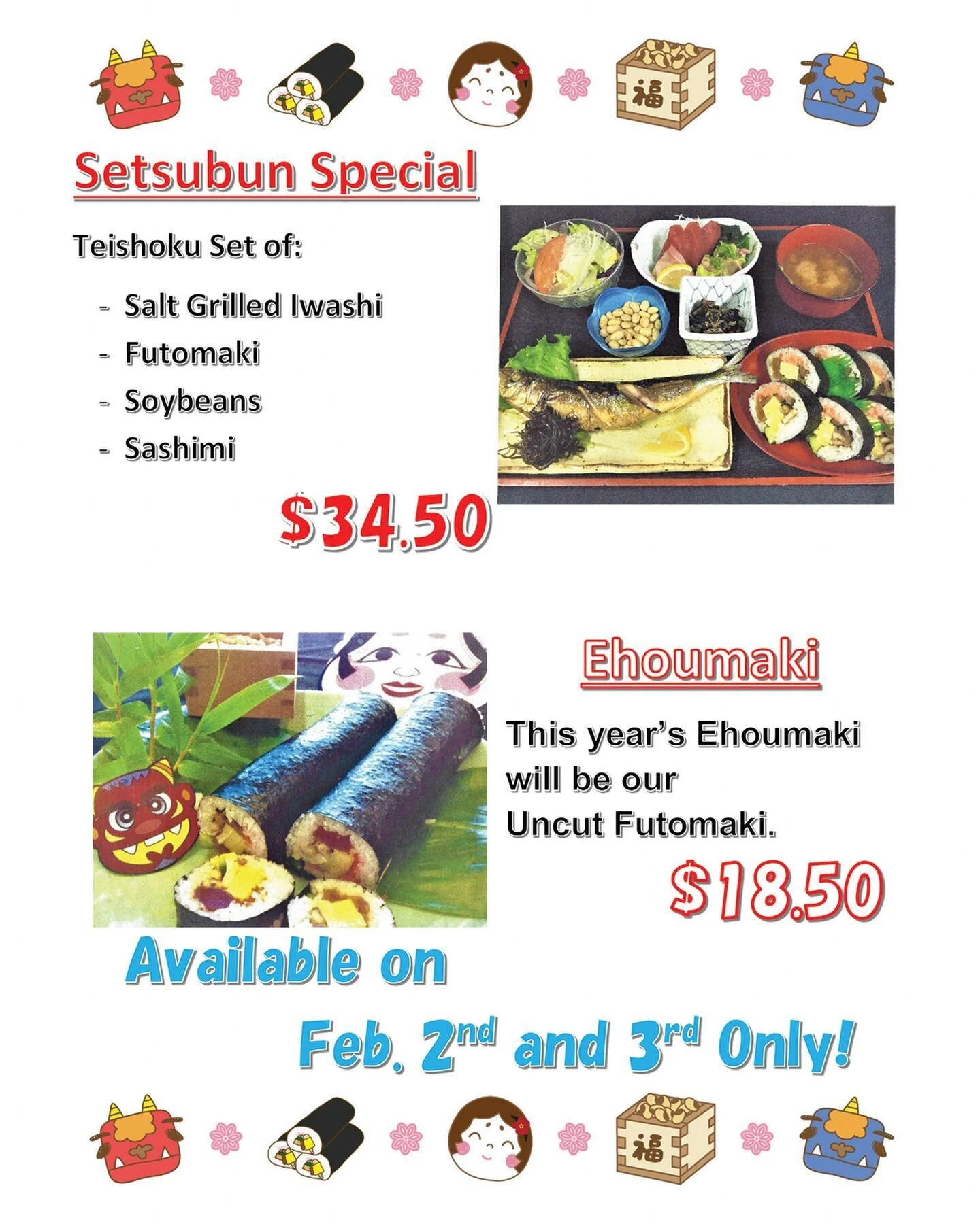 Please give us a call to ensure that we have open tables or seats available at the sushi bar prior to your arrival.